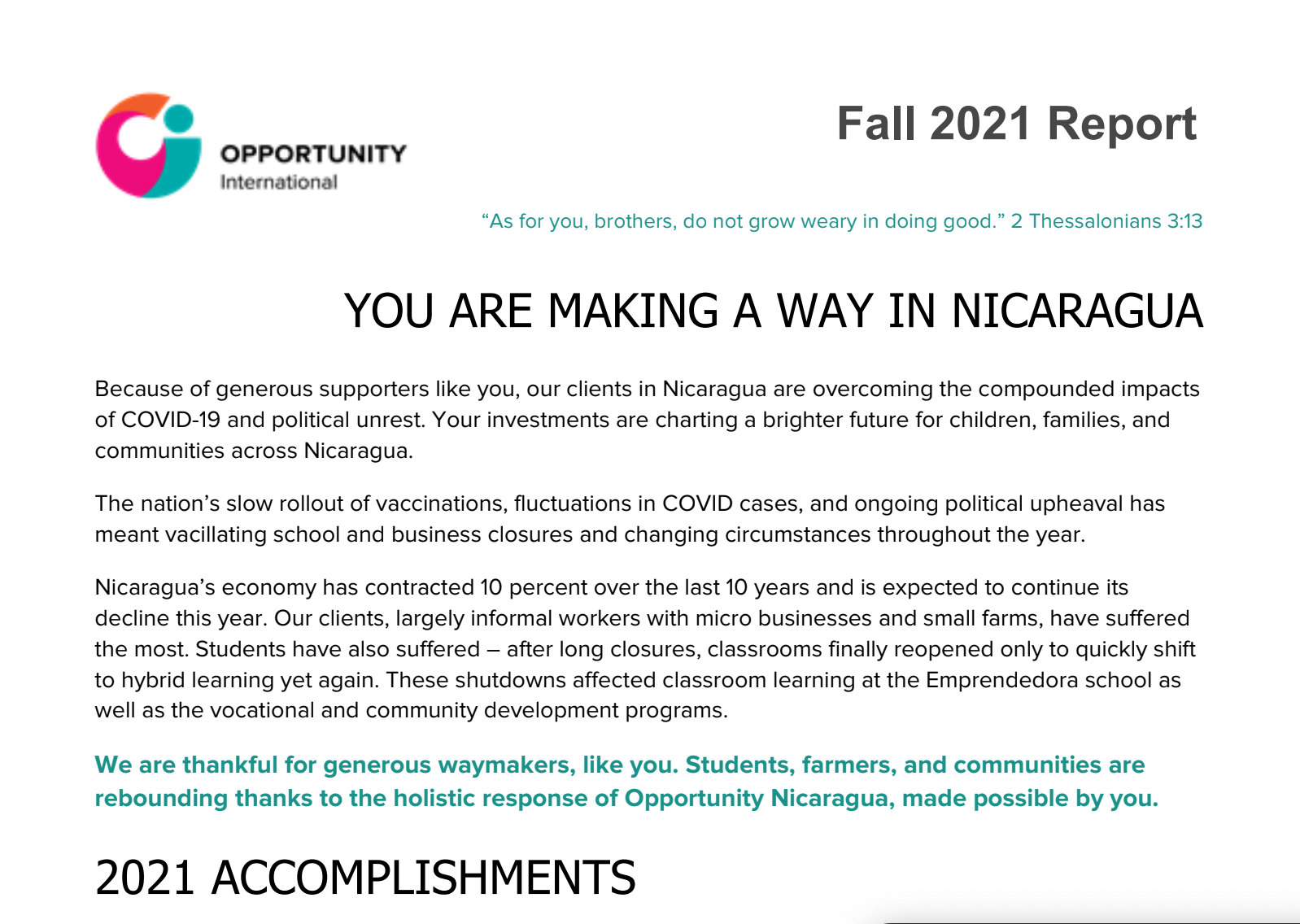 Subscribe Sign up with your email address to receive news and updates on Opportunity International. First Name Last Name Email Address Sign Up Thank you! Past Newsletters Fall 2021 Fall 2022 Spring 2021 Spring 2022